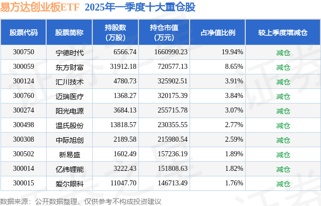 根据2025基金Q1季报公募基金重仓股数据,重仓该股的公募基金共268家,其中持有数量最多的公募基金为易方达基金的易方达创业板ETF。易方达创业板ETF目前规模为832.79亿元,最新净值2.0221(6月13日),较上一交易日下跌1.07%,近一年上涨15.89%。该公募基金现任基金经理为成曦刘树荣。成曦在任的基金产品包括:易方达创业板ETF联接A,管理时间为2016年5月7日至今,期间收益率为-0.52%;易方达深证100ETF,管理时间为2016年5月7日至今,期间收益率为38.59%;易方达上证科创板50成份ETF,管理时间为2020年9月28日至今,期间收益率为-30.15%。刘树荣在任的基金产品包括:易方达深证100ETF联接A,管理时间为2017年7月18日至今,期间收益率为24.35%;易方达创业板ETF联接A,管理时间为2017年7月18日至今,期间收益率为23.51%;易方达深证100ETF,管理时间为2017年7月18日至今,期间收益率为22.35%;