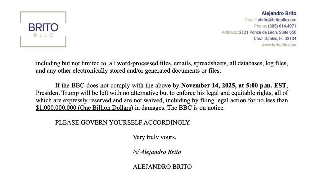 11月10日,相关文件显示,特朗普的律师要求BBC在美东时间11月14日下午5点之前完全撤回包含剪辑内容的纪录片,道歉并“适当补偿”“受到伤害”的特朗普,否则将面临法律诉讼,包括特朗普将提起的至少10亿美元的损害赔偿。
