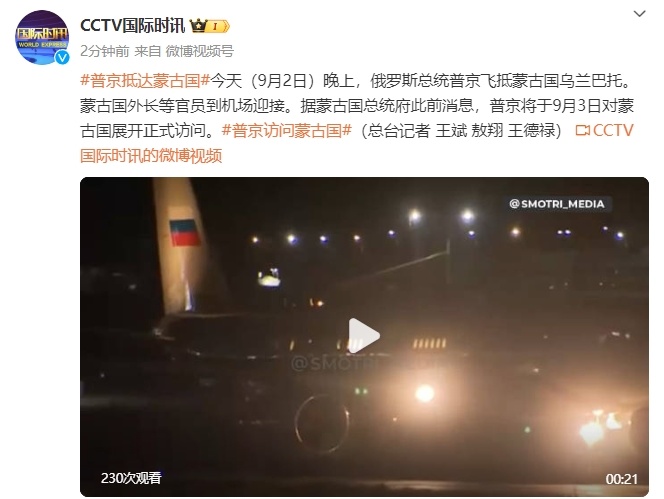 今天(9月2日)晚上,俄罗斯总统普京飞抵蒙古国乌兰巴托。蒙古国外长等官员到机场迎接。据蒙古国总统府此前消息,普京将于9月3日对蒙古国展开正式访问。(总台记者 王斌 敖翔 王德禄)